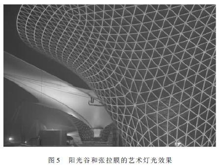 LED 灯光色彩的变化和阳光谷律动的星星点光,激发起人们对未来无尽的信心和畅想。绿色、湖兰色和淡紫色、柠檬黄和淡黄色、红色和橘黄色等各种色调组合的灯光,以及这些灯光均匀投在张拉膜上,与阳光谷上的太阳能星光灯、LED 星光灯一起,预示着一年四季春、夏、秋、冬在世博轴平台上营造出的氛围和意境,让人们不管是漫步在世博轴平台上还是在园区远眺,它梦幻、艺术般灯光的场景,都能给人轻松、凉爽、灿烂、温暖的幸福感觉。站在10 米平台上,头顶是色彩变化十分丰富而且壮观的阳光谷和张拉膜,身边则是一种超然于物外的白色调静态场景,上下相谐舒张有度( 图5)。