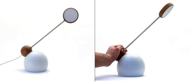 The base of the lamp is a metallic hollow sphere and the arm consists of a wooden sphere, a pipe and a wooden disk which encloses the light source. At the bottom of the wooden sphere are powerful neodymium magnets so the arm can freely move and rotate on the entire surface of the metallic sphere. The wooden sphere works as an ergonomic handle which the user can grab and manipulate the lamp in whatever way he wants.